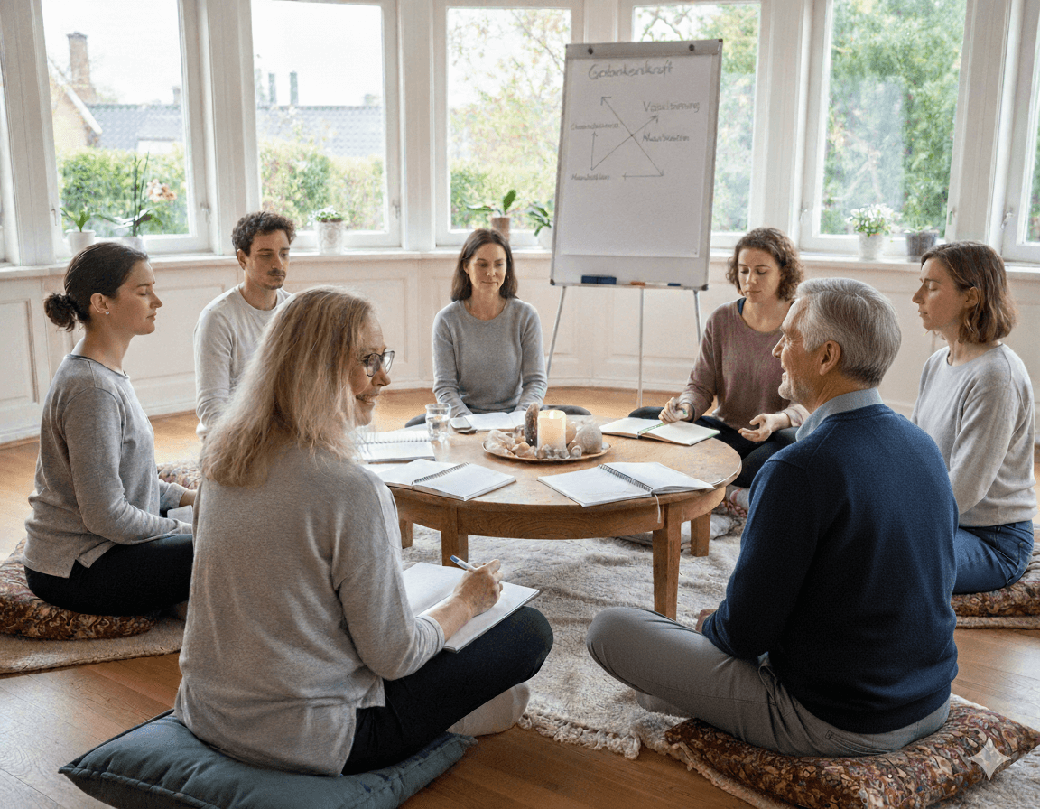 Gemeinsame Meditation, Heilarbeit in der Gruppe und Raum für Austausch.